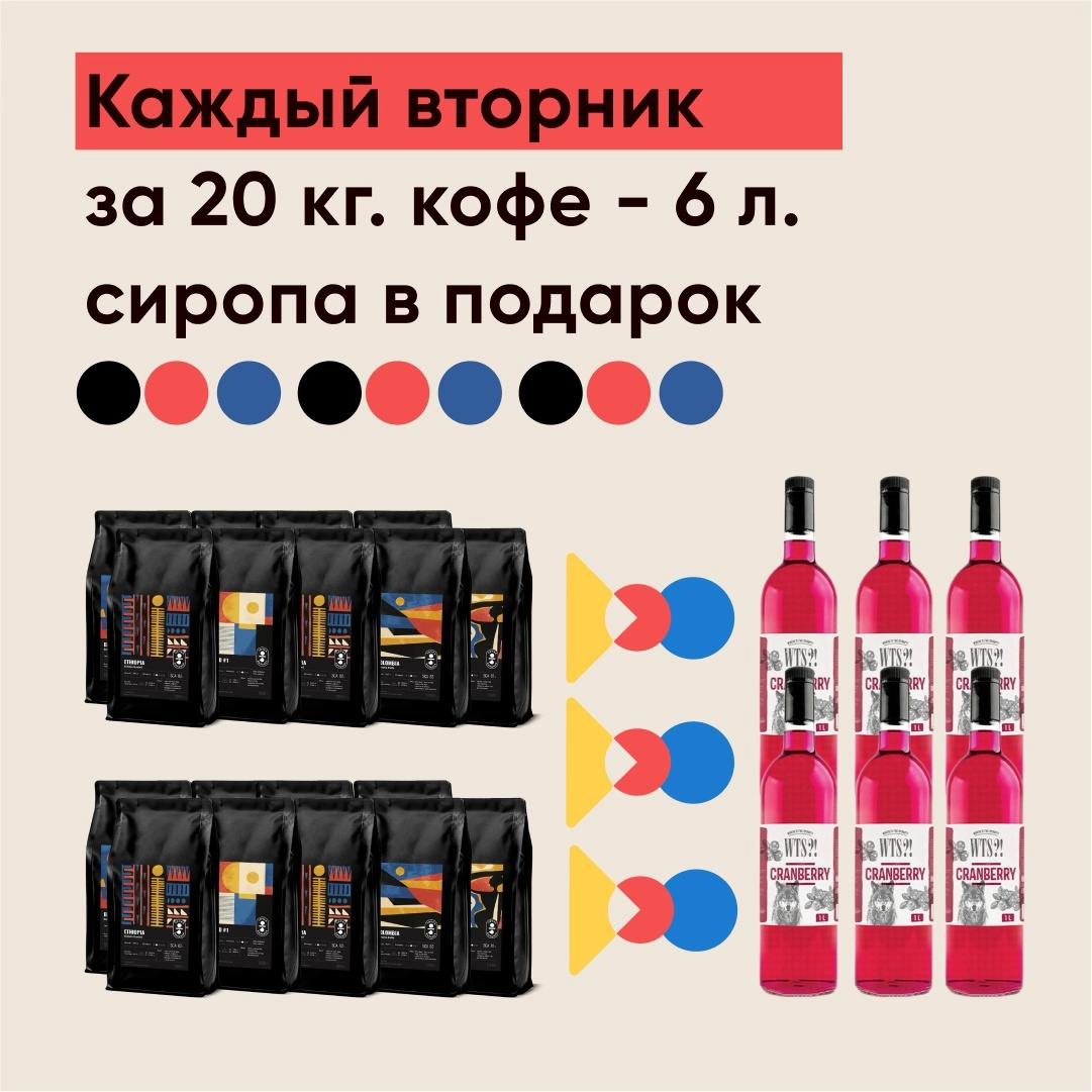 Каждый вторник при покупке 20 кг. кофе вы в подарок получаете 6 литров сиропа WT...
